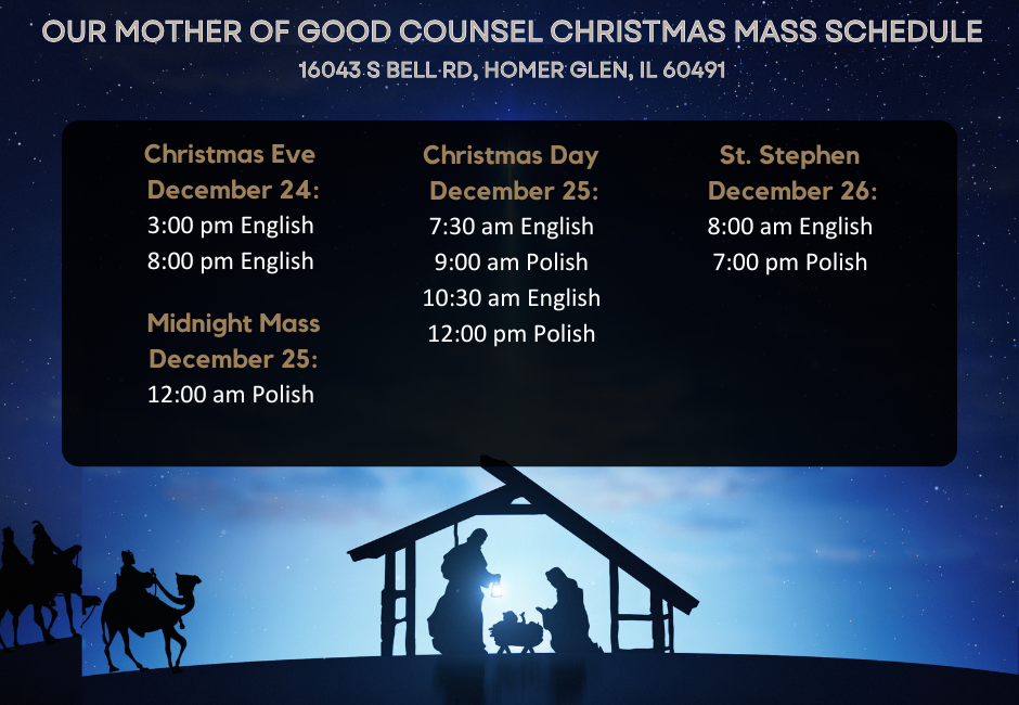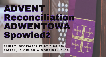 **PIĄTEK, 19 GRUDNIA** Godzina: 19:00. Our Advent Reconciliation service is schduled for Friday December 19 at 7:00 PM. Please enter through the Adoration Chapel doors. This is your last opportunity for Confession before Christmas.