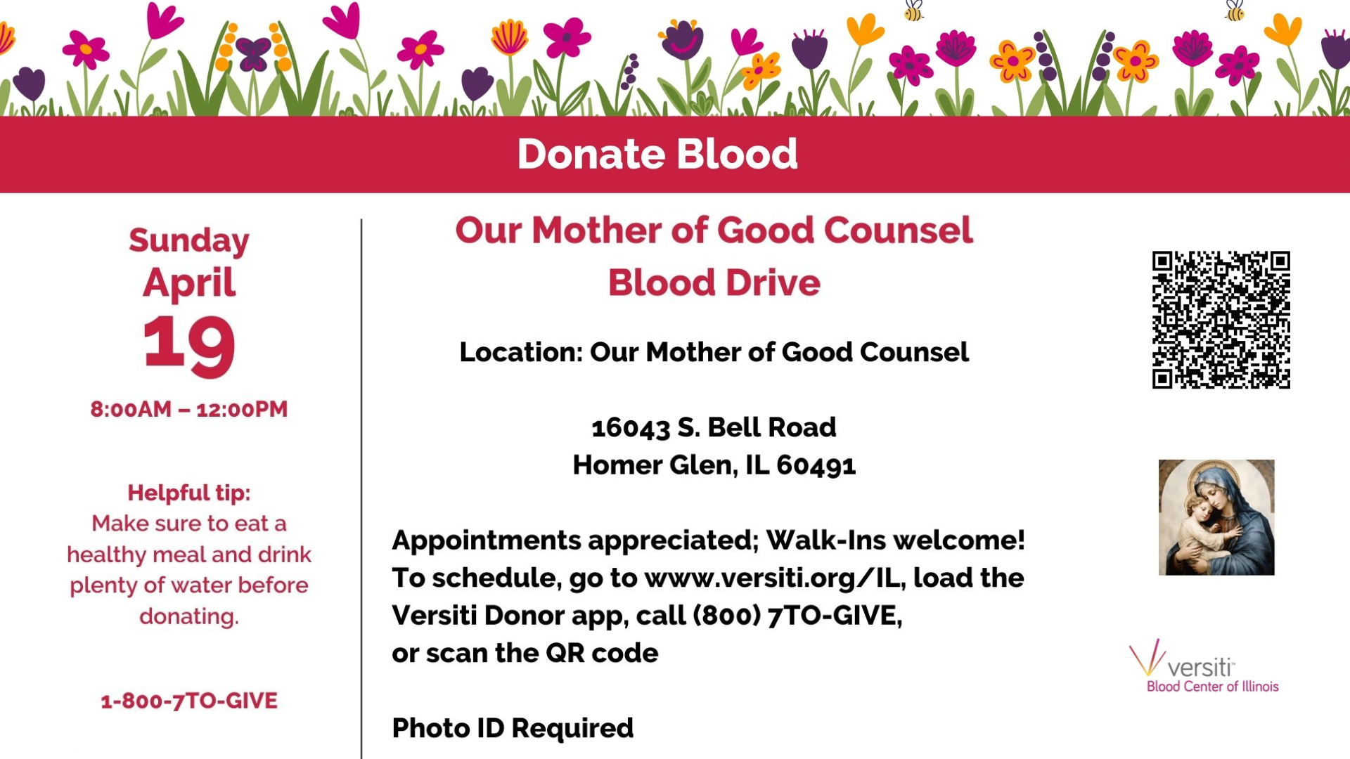 Schedule your appointment to donate blood here. Walk-ins are also welcome. The blood drive is Sunday, April 19th from 8am-12pm;