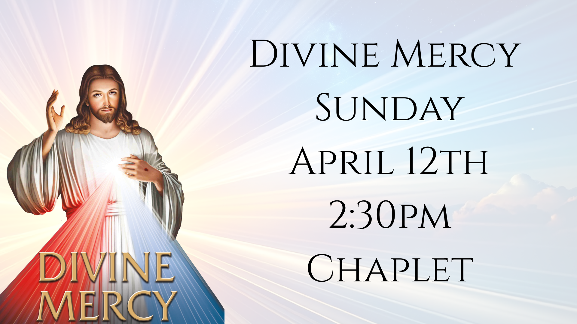 Join us Sunday, April 12th at 2:30pm in the Church to pray the Chaplet of Divine Mercy.