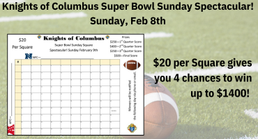 This Knights of Columbus will be in the Narthex this weekend before and after Mass to sell Super Bowl Squares. You can pick any available square and $20 gives you a chance to win up to $1400.