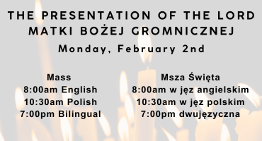 Monday, February 2nd, is the Feast of The Presentaion of The Lord. There is a an 8:30 am English Mass, 10:30 am Polish Mass, and a 7:00 pm Bilingual Mass.